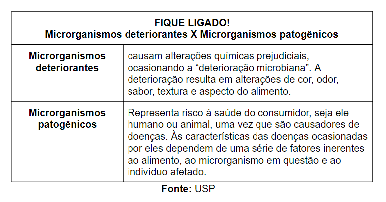 | Microorganismos deteriorantes | Causam alterações químicas prejudiciais, ocasionando a “deterioração microbiana”. A deterioração resulta em alterações de cor, odor, sabor, textura e aspecto do alimento. |