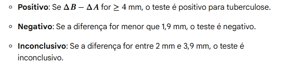 3 – Teste Cervical Comparativo (TCC) pode ser utilizado como teste confirmatório em animais reagentes ao TCS ou ao TPC ou como prova de rotina em rebanhos com histórico de reações inespecíficas, em estabelecimentos certificados como livres e em estabelecimentos com criação de bubalinos, visando garantir boa especificidade diagnóstica. Na região cervical ou na região escapular, inocula-se a PPD aviária cranialmente e a PPD bovina caudalmente a uma distância de quinze a vinte centímetros entre as duas.  A diferença entre o aumento da espessura da dobra da pele no local da inoculação da PPD bovina (ΔB) e do aumento da espessura da dobra da pele no local da inoculação da PPD aviária (ΔA) é calculada e interpretada conforme: