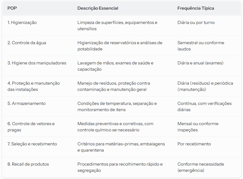 Para facilitar, aqui vai uma tabela resumida dos 8 POPs obrigatórios, com descrições essenciais e frequência típica (baseada na RDC 275 e guias da ANVISA):